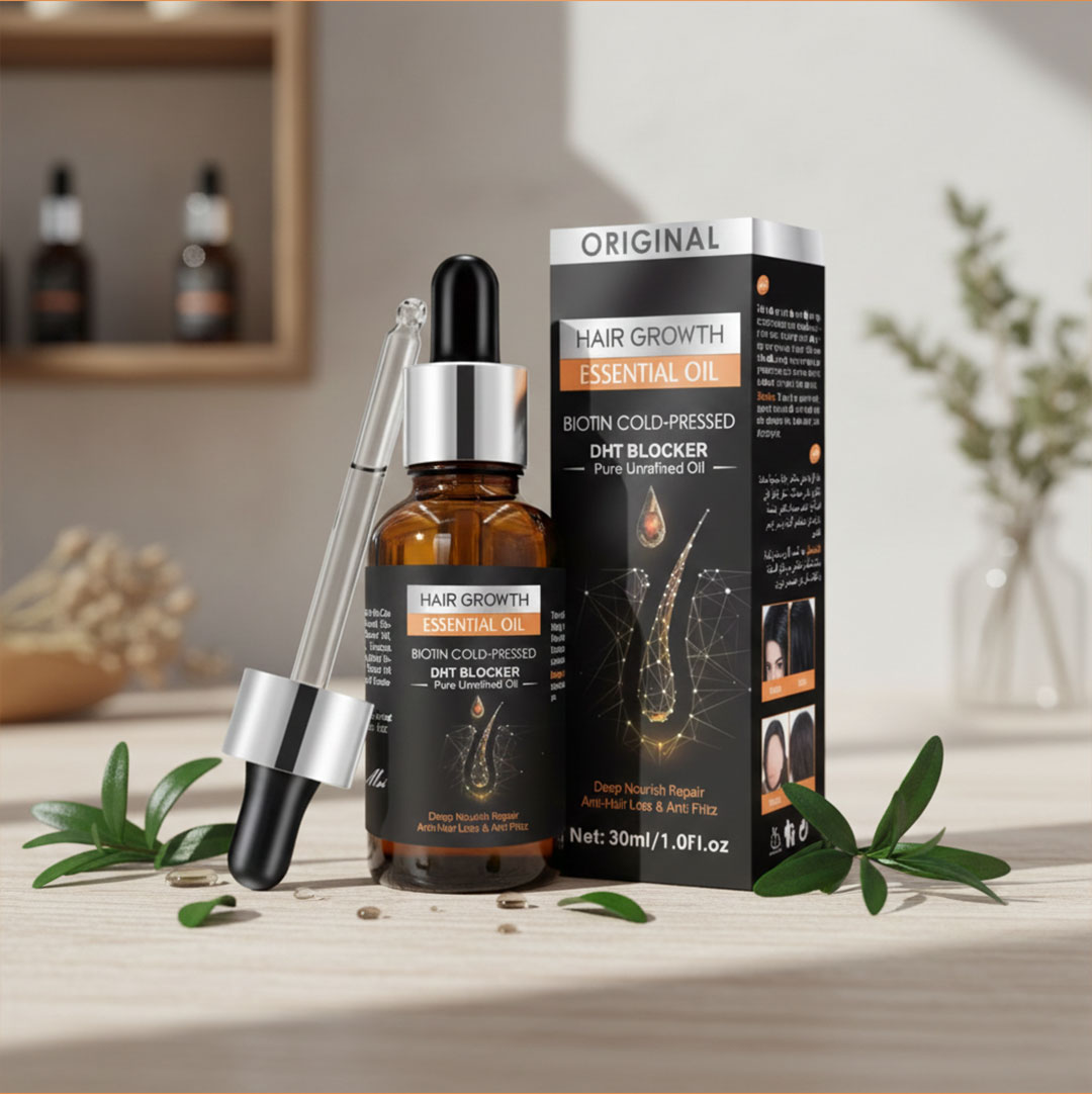 Hair Growth Essential Oil 30ml – A nourishing blend that strengthens hair, promotes growth, and adds natural shine. Suitable for all hair types.